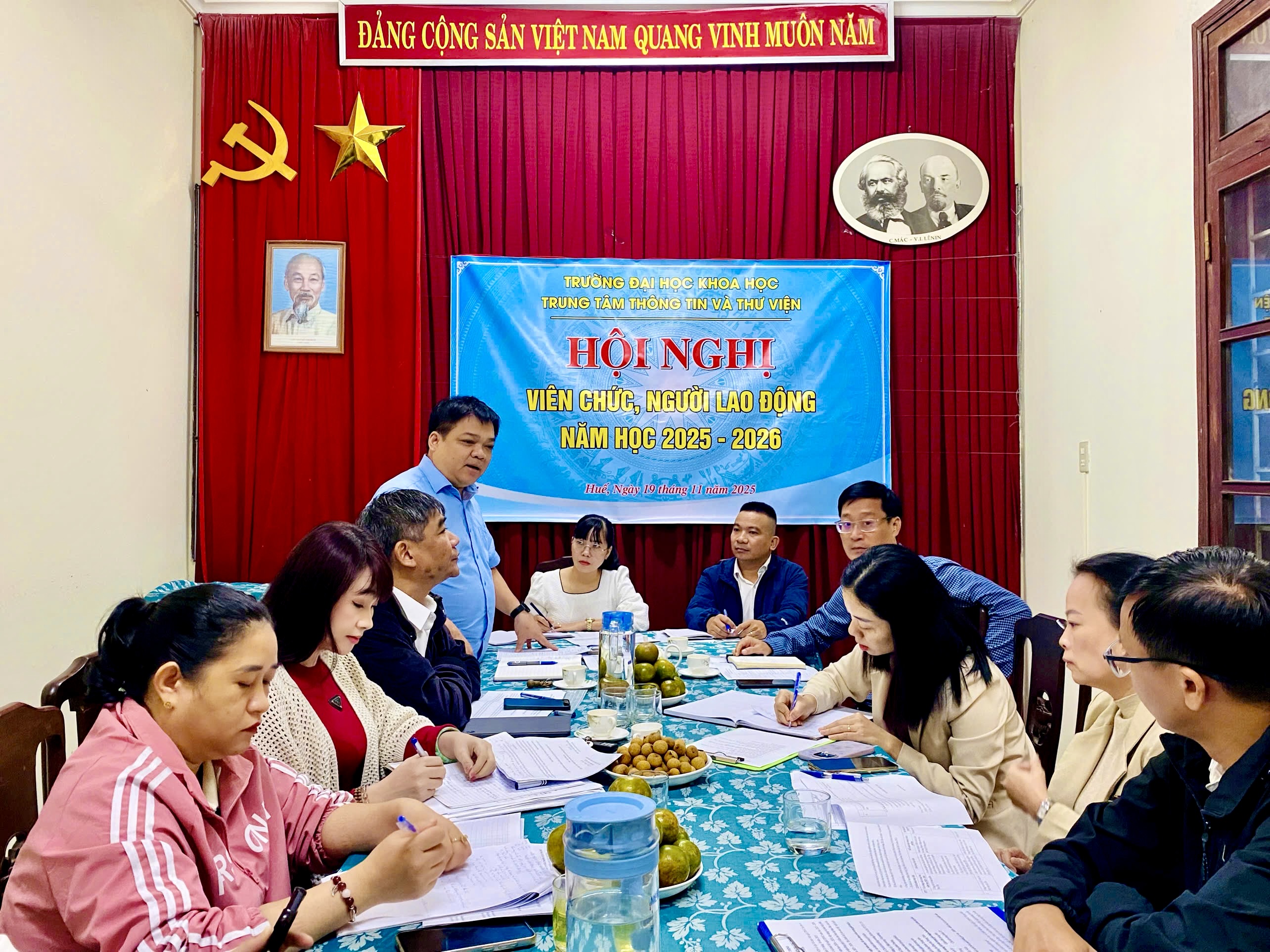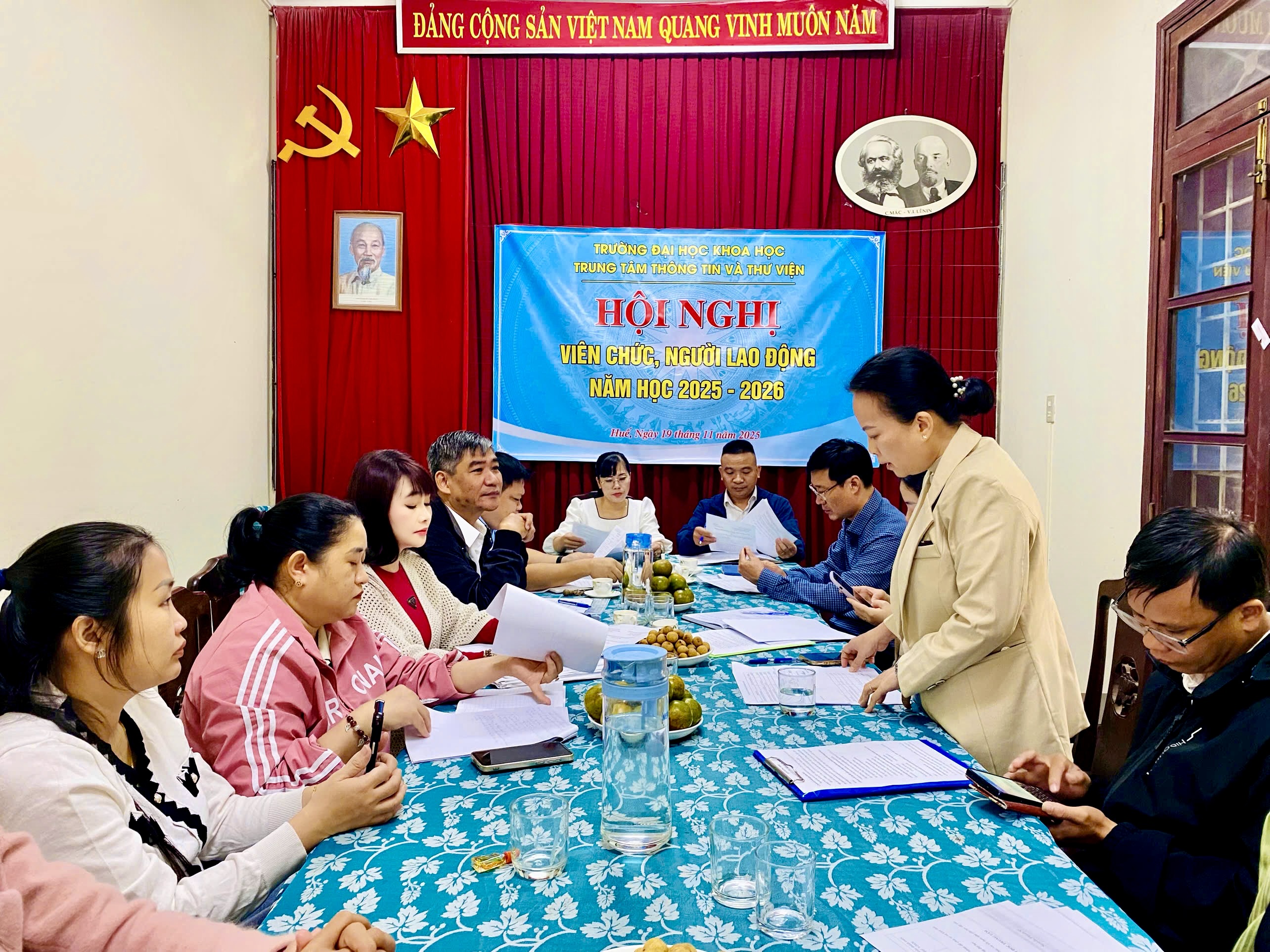 Ngày 19/11/2025, Trung tâm Thông tin và Thư viện tổ chức Hội nghị viên chức, người lao động năm học 2025 - 2026. Hội nghị có ý nghĩa quan trọng, nhằm đánh giá và tổng kết những kết quả đã đạt được trong năm học 2024 - 2025 và phương hướng nhiệm vụ năm 2025 - 2026.